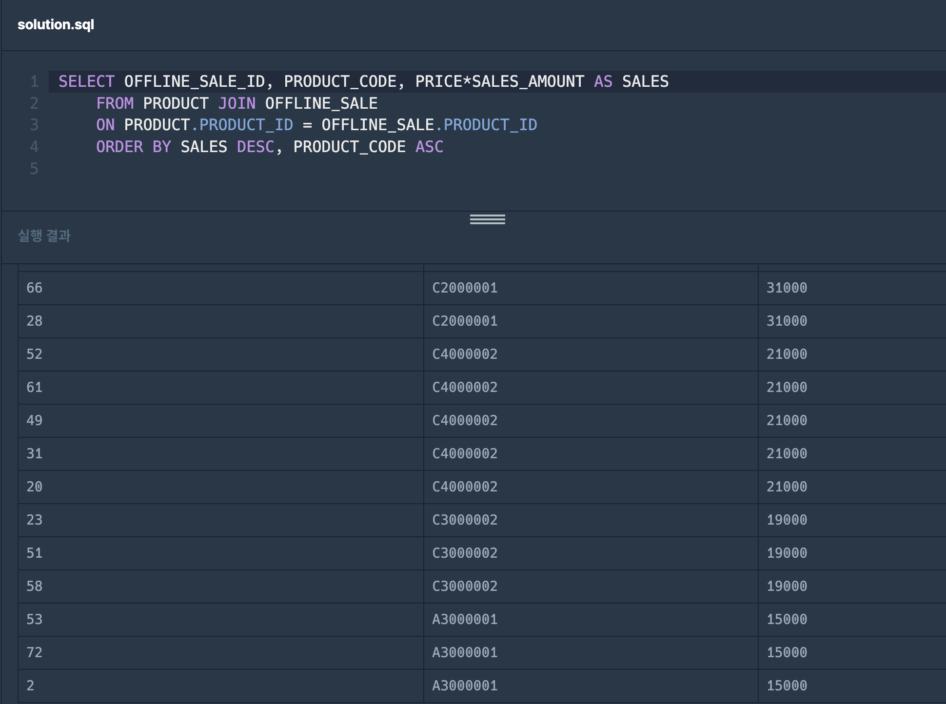 ID값을 기준으로 Join을 이용하여 PRODUCT 테이블 내 가격정보와 OFFLINE_SALE 테이블 내 판매량 정보를 곱한 SALES 열 생성