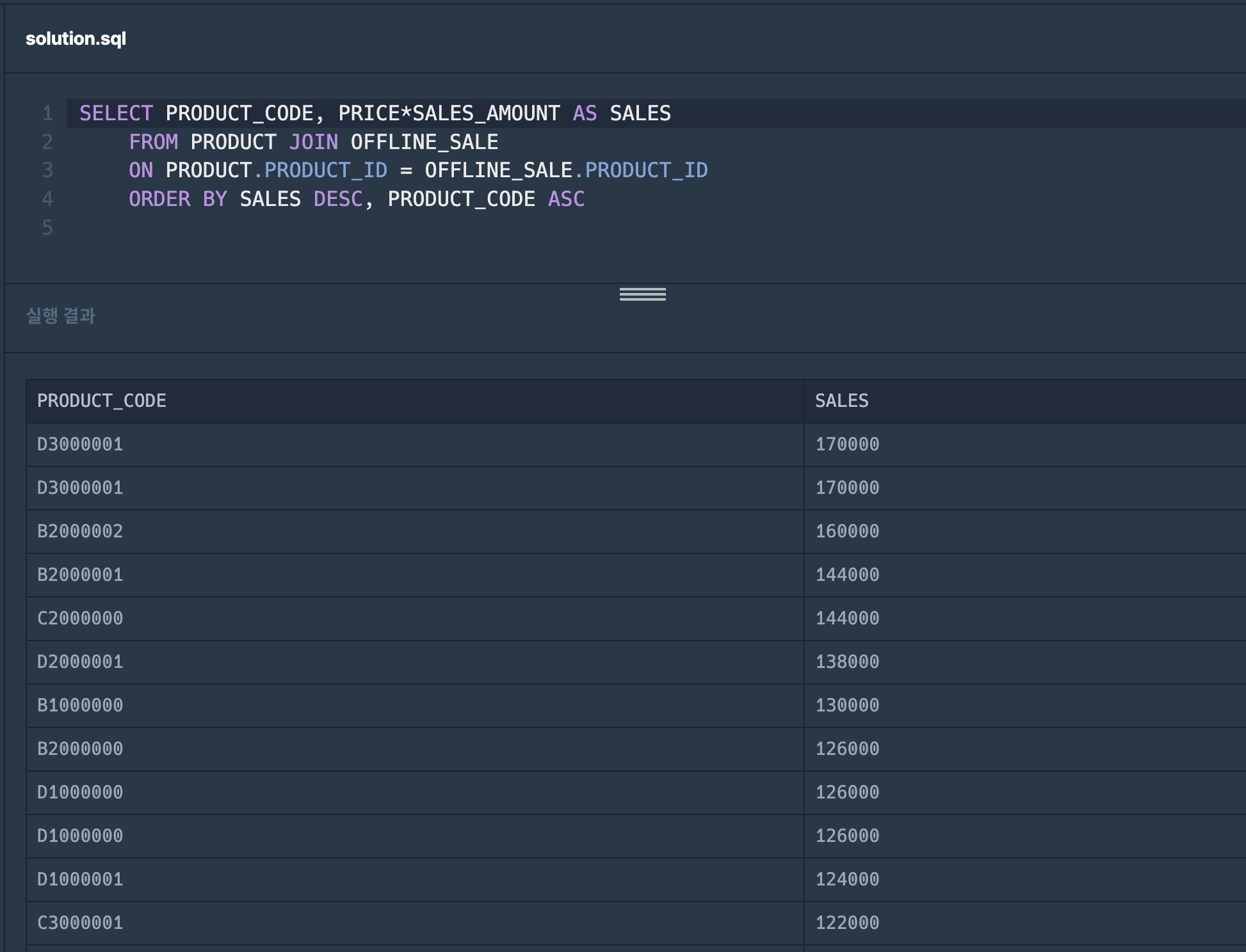 판매중인 상품 정보(ID, 상품코드, 가격)를 담은 PRODUCT 테이블과 오프라인 판매 정보를 담은 OFFLINE_SALE 테이블이 주어짐
