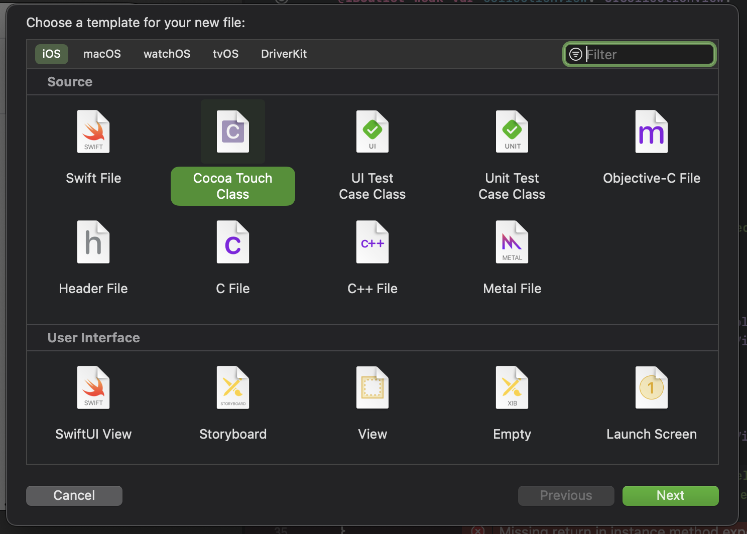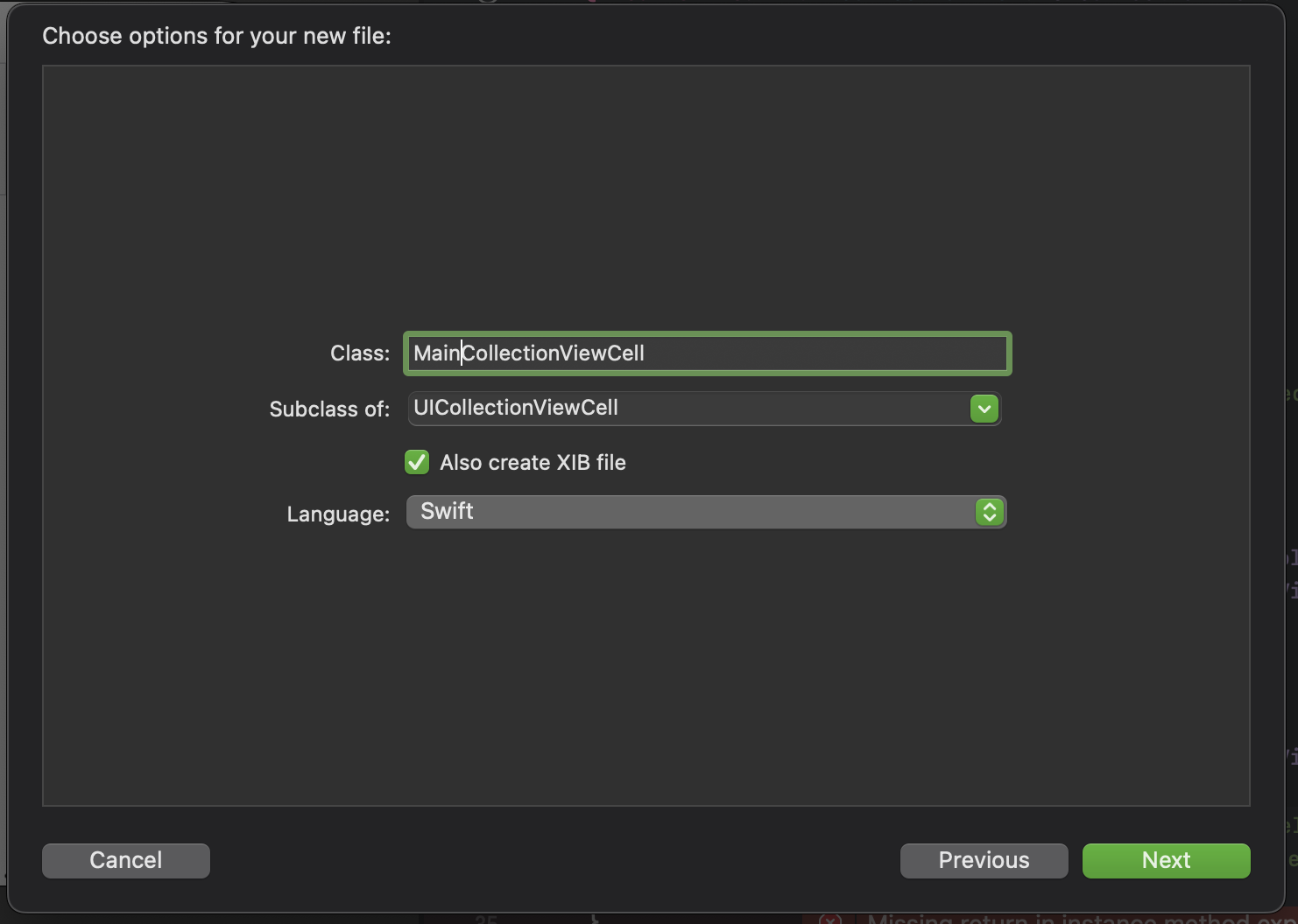 "Also create XIB file"을 반드시 체크!!!해주어야만 .xib이 생성됨