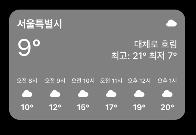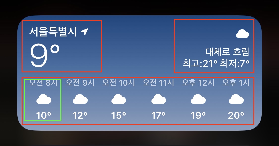 - 우측 상단의 구름 이미지, 날씨, 최고/최저 기온을 포함한 UIStackView (수직 방향)