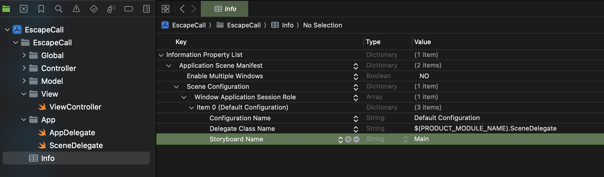 4. 프로젝트 Target 내 Build Setting UIKit Main Storyboard File Base Name 제거