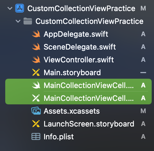 4. 파란색 배경의 셀이 가지는 CollectionView의 셀을 정의하는 클래스(초록색 아이템)를 정의